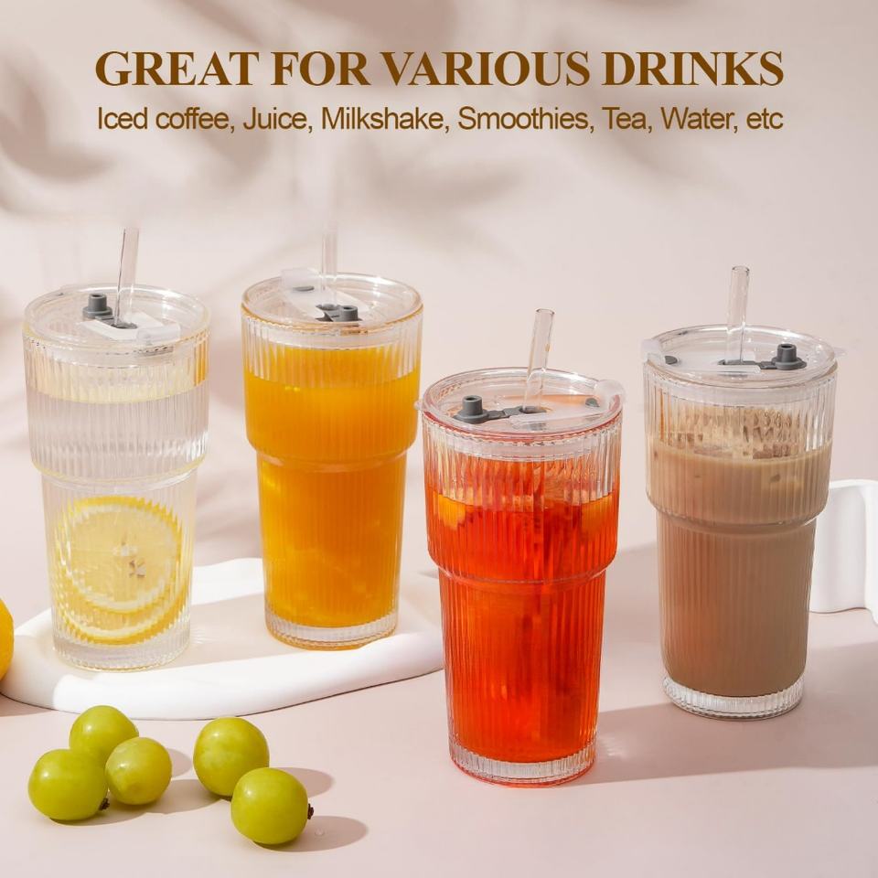 600ml Stripe Glass Cup with Lid and Straw Transparent Drinking Glasses for Juice Water and Iced Coffee Cups Mug Drinkware