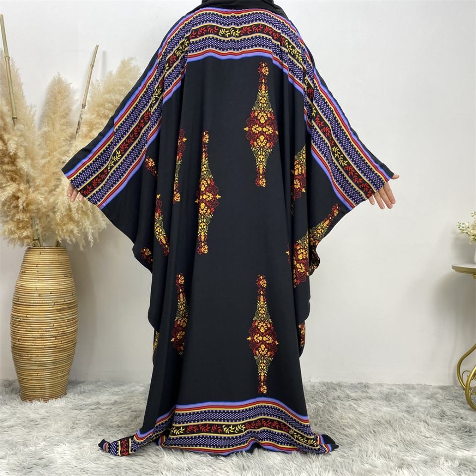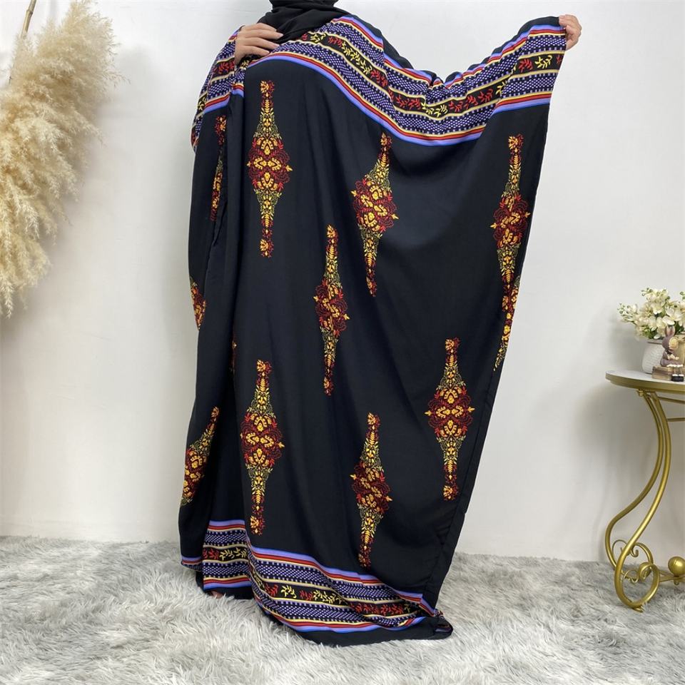 6427# Traditional Colorful Pattern Print Big Batwing Sleeves Women Ramadan Prayer Muslim Islamic Abaya Dress Eid