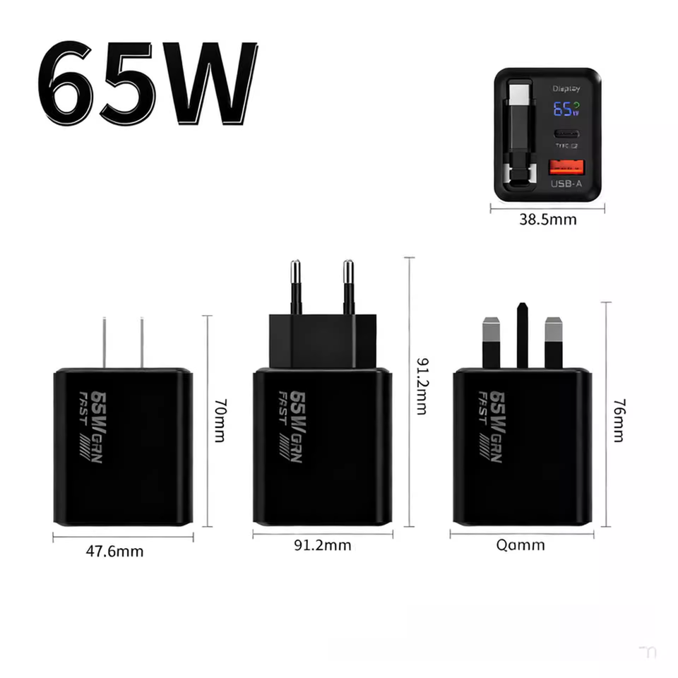 65W GaN Charger USB Type C Ports Built in Retractable Cable Digital Display Charger For iPhone Tablet