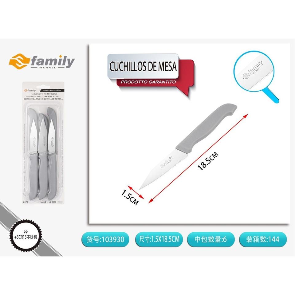 6pcs Grey PP Handle Table Knives 0.7 Thick 18.5cm for Kitchen