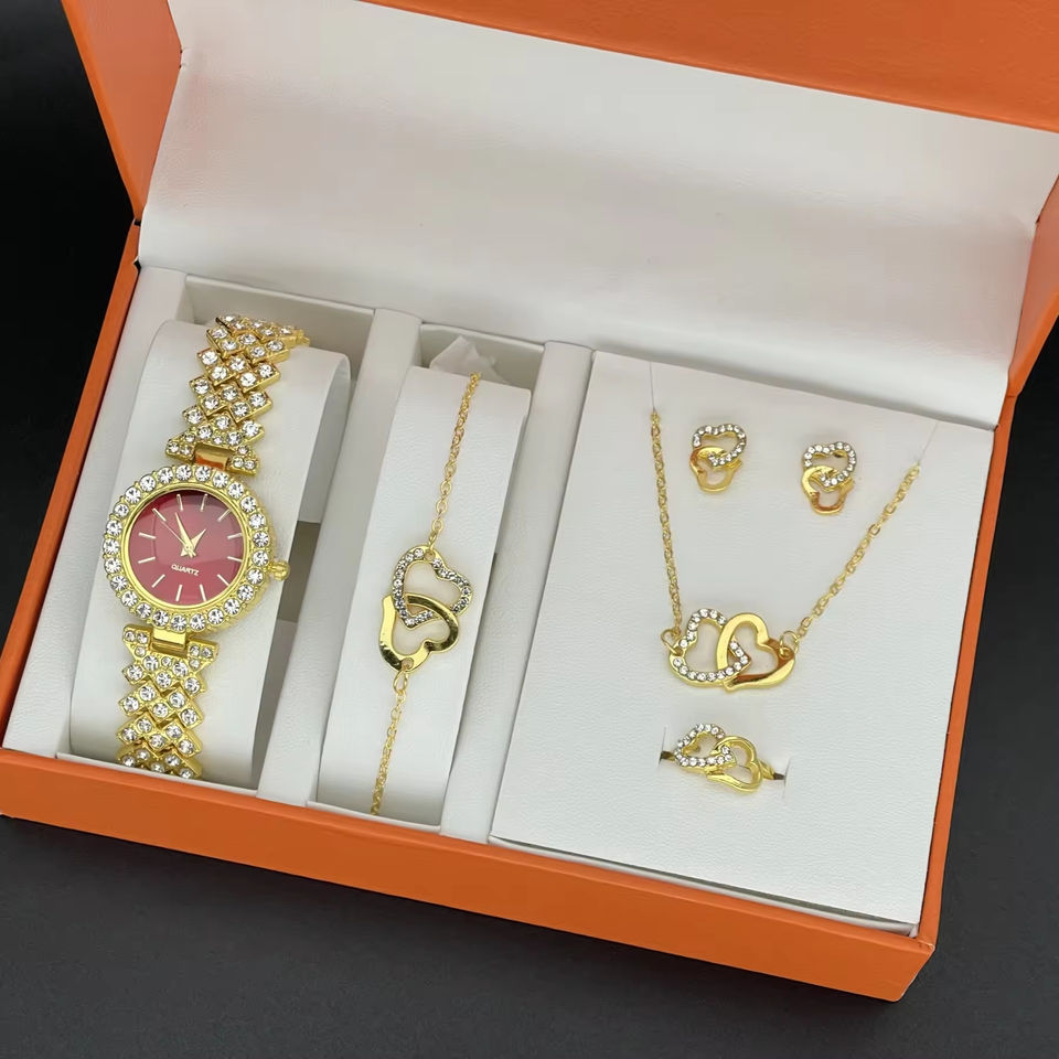 6pcs Women's Luxury Rectangle Fashion Digital Watch Set with Rhinestone Gold Silicone Band 50mm Pointer Dial for Unisex