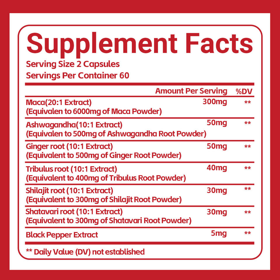 MACA Extract, Shilajit Extract, Ginger Root Extract, Ashwagandha Extract