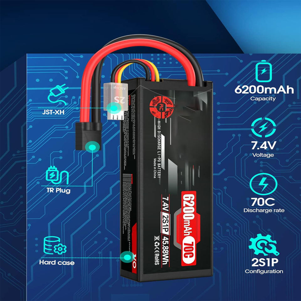7.4V 70C 6200mAh 2S Lipo Battery for Tracxas Plug RC Car Helicopter Truck Truggy Quadcopter Drone FPV-2 Pcs