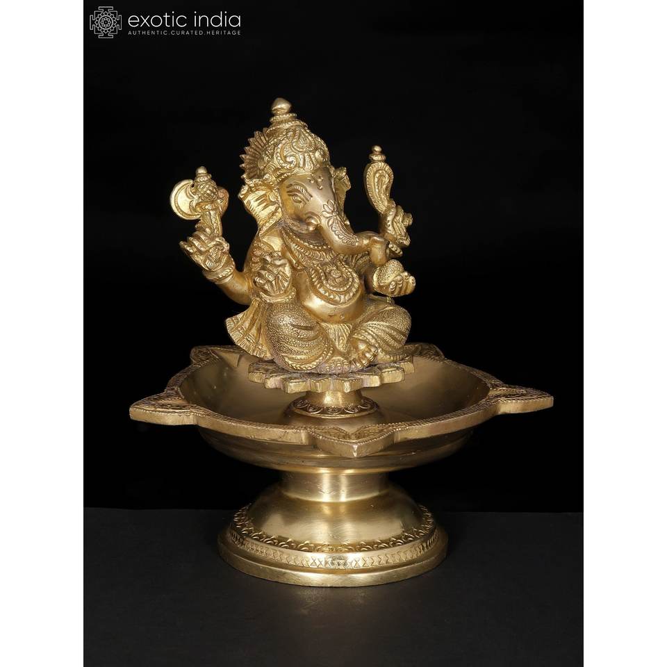 7-Inch Traditional Indian Design Ganesha Brass Oil Lamp with Five Wicks for Home Decor and Spiritual Use