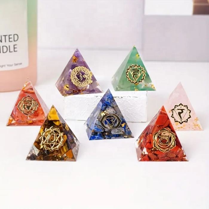 7 Piece Orgone Crystal Pyramid Set with Chakra Symbols Energy Balancing Gemstone Resin Pyramids Spiritual Home Decor Halloween