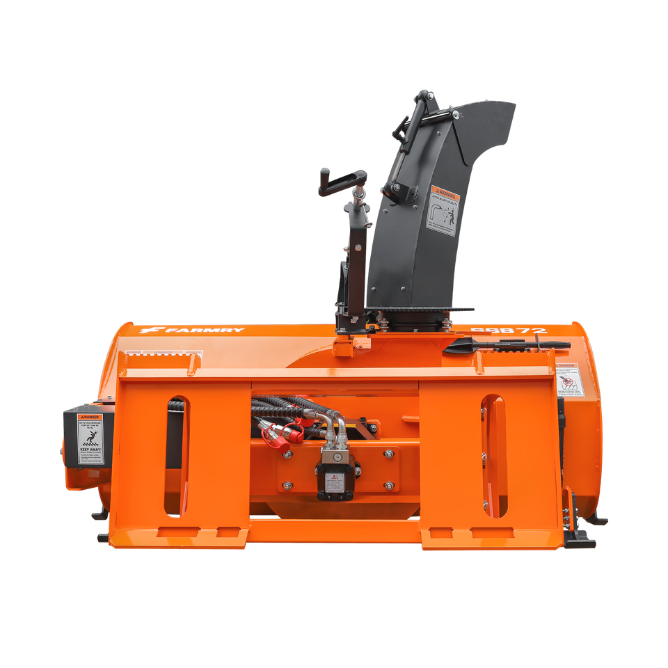 SSB72 72 Skid Steer Snow Blower 45-75 HP Engine Hydraulic Flow 16-21 GPM 24 Diameter Impeller Snow Chute Manual 360 Shovel