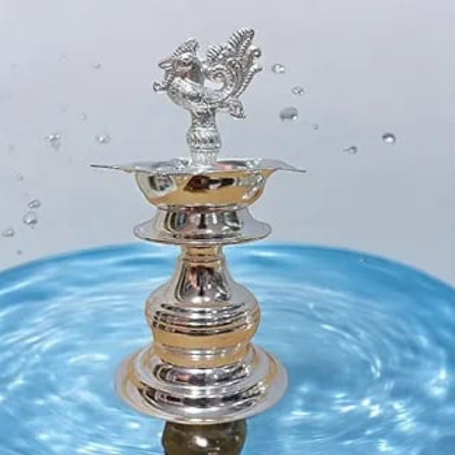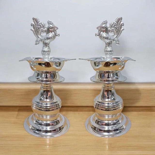 7x3 Inch German Silver Peacock Handle Diya Flameless Home & Temple Festival Chandelier for Christmas Decorations