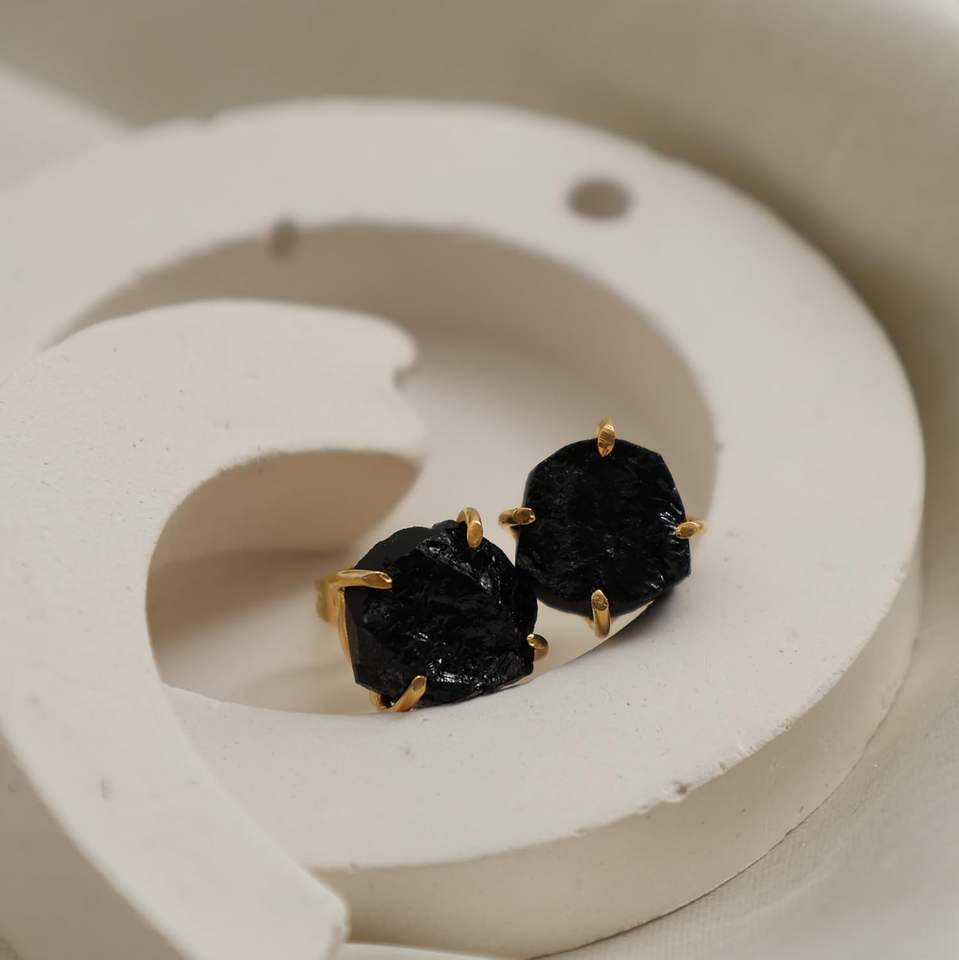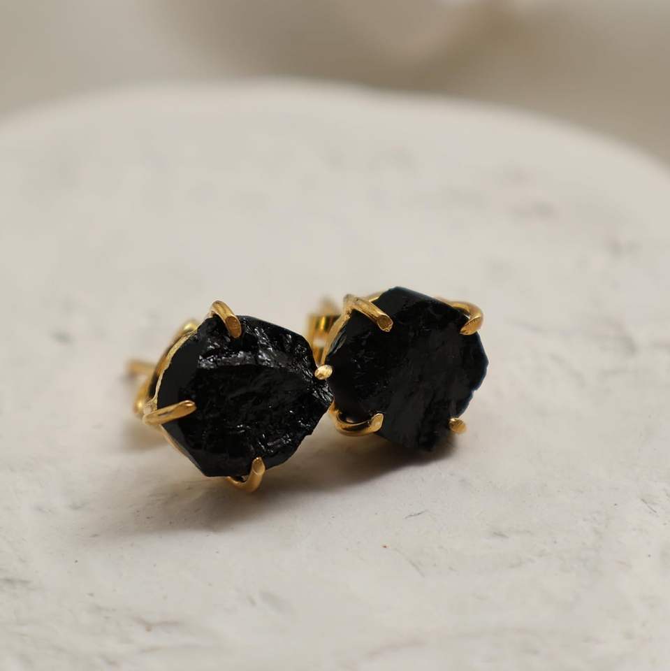 8-10mm Raw Black Tourmaline Stone Gold Plated Prong Set Stud Earrings Handmade Birthstone Dainty Minimalist Jewelry for Women