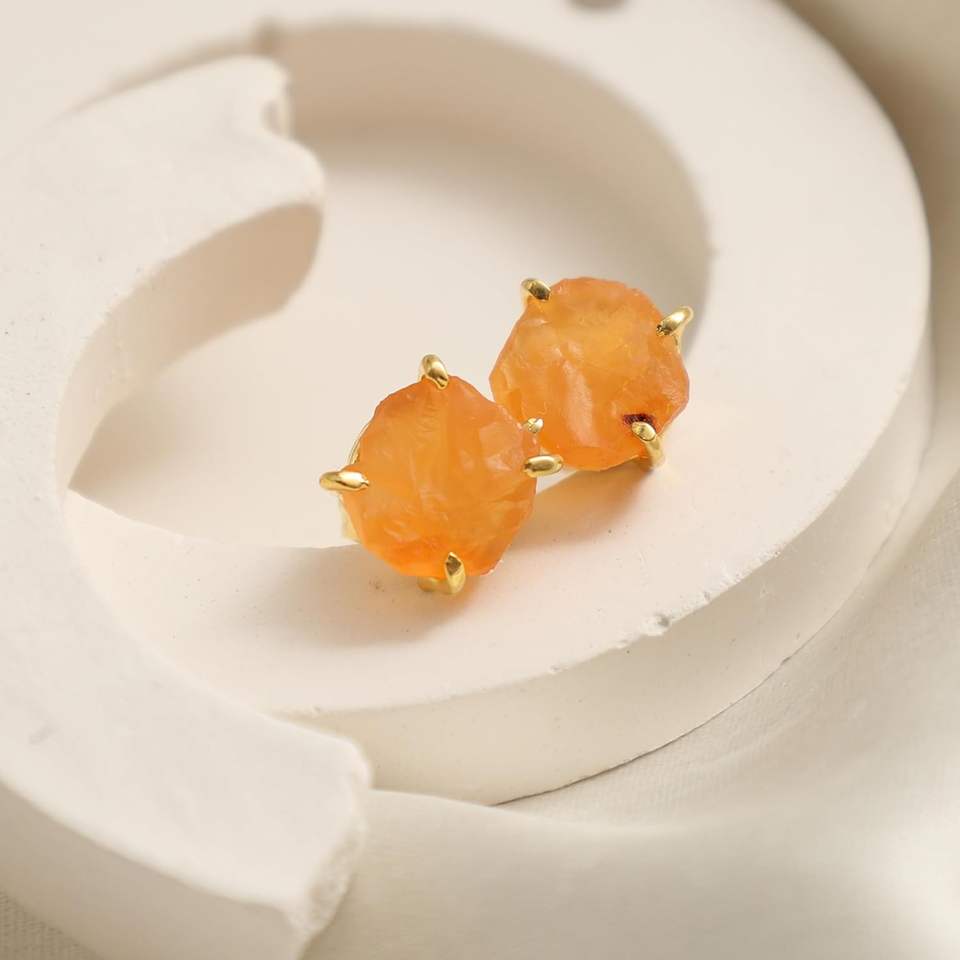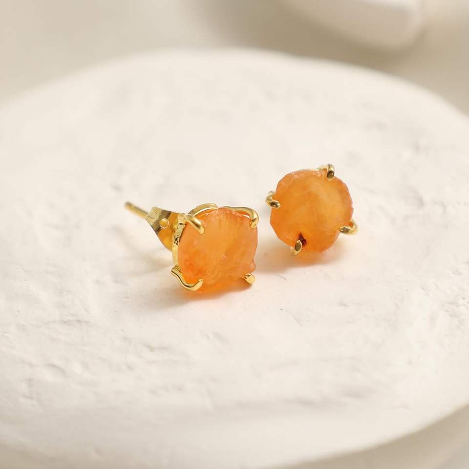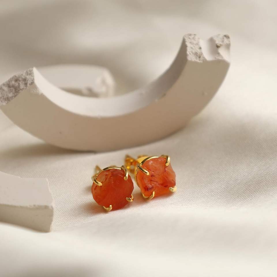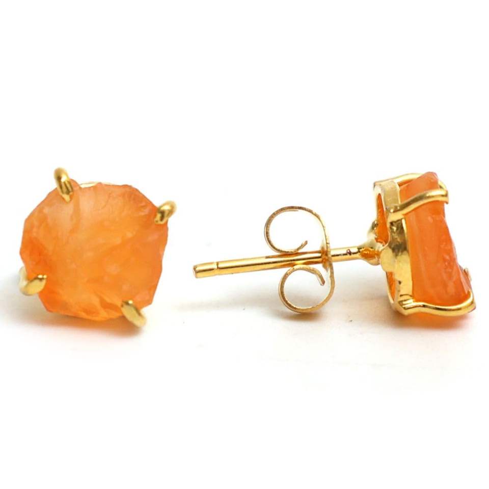 8-10mm Raw Carnelian Stone Gold Plated Prong Set Stud Earrings Handmade Birthstone Dainty Minimalist Jewelry for Women