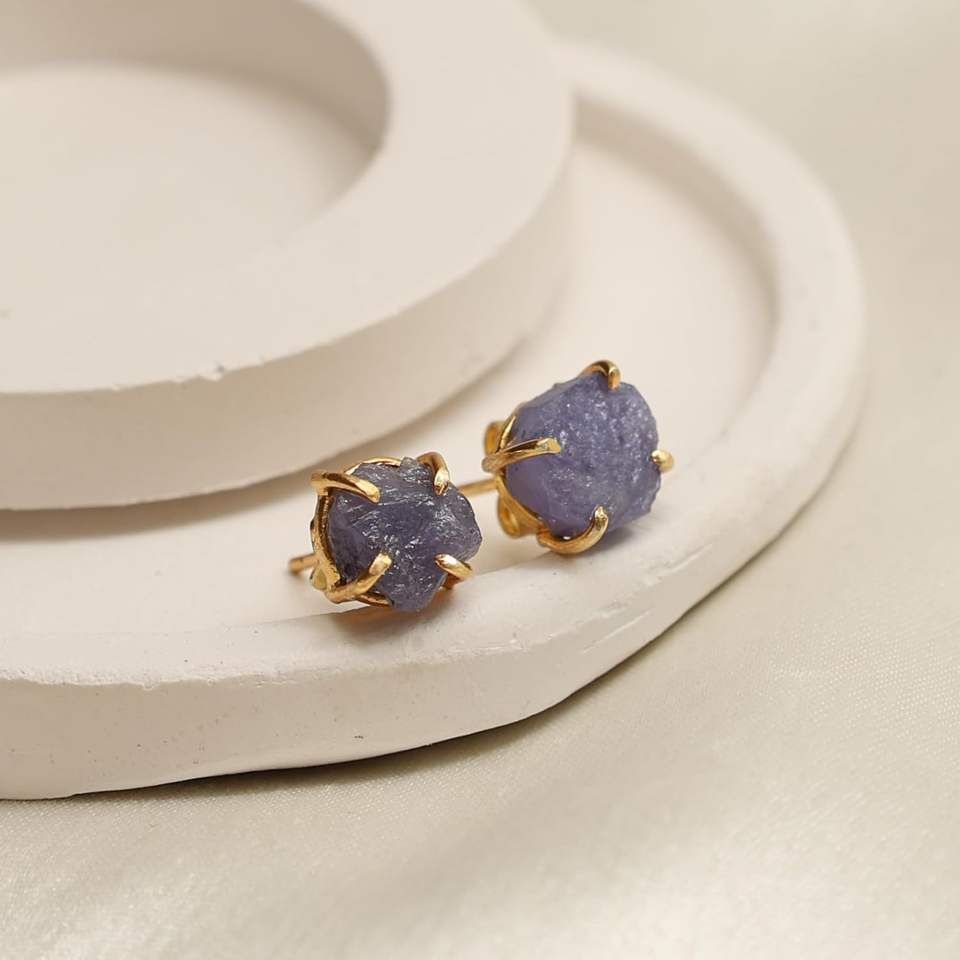 8-10mm Raw Tanzanite Stone Gold Plated Prong Set Stud Earrings Handmade Birthstone Dainty Minimalist Jewelry for Women