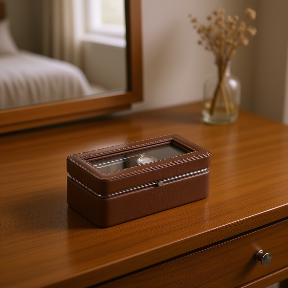 Brown Leather Watch Display Case 4-Slot With Tempered Glass Cover Rectangle Button Closure For Watch Storage