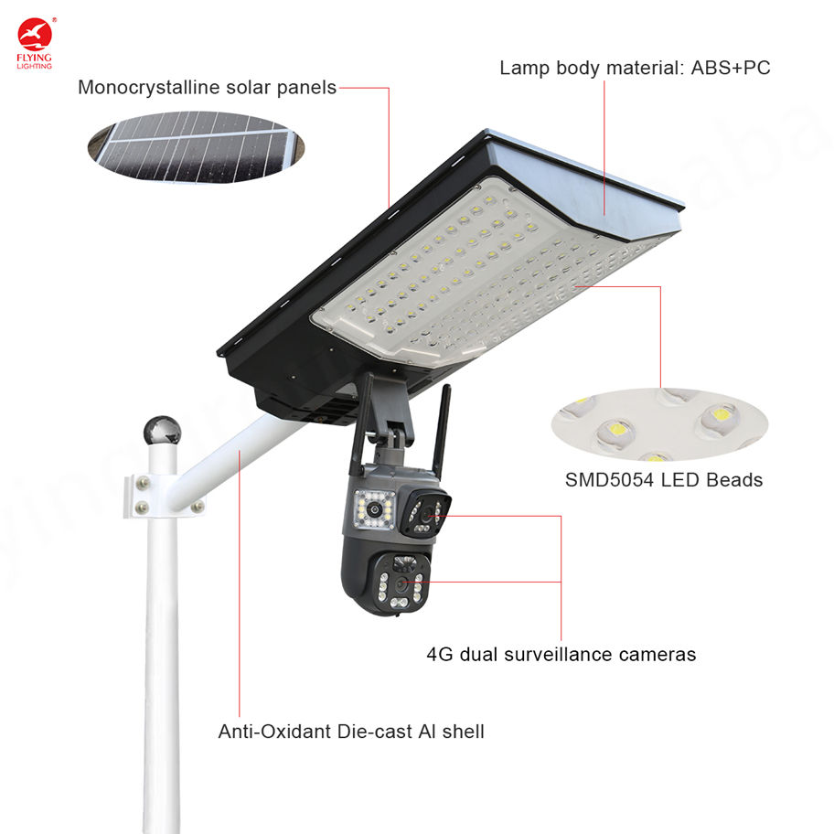 800W 1000W Solar Street Light with 360 Degree Dual CCTV Camera 4G SIM Card IP65 Waterproof LED ABS Material