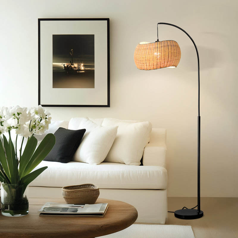 81 In. Boho Style Arched LED Floor Lamp with Wicker Rattan Shade Wave Pendant Design Bulb Included Home Furniture