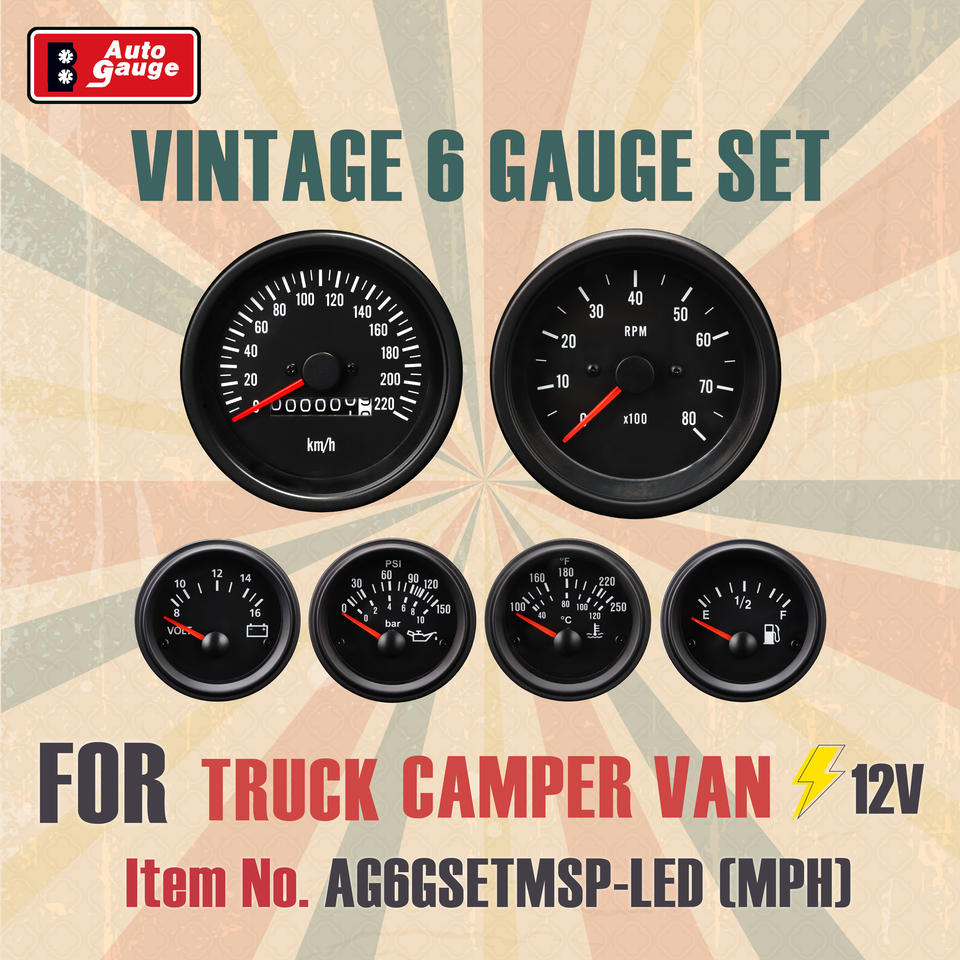 85mm 3-3/8 Inch 52mm 2-1/16 Inch Mechanical Vintage 6 Gauge Set 220KMH 12V Black Faceplate White Backlight Truck Camper Van