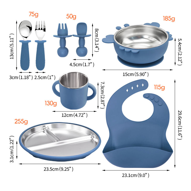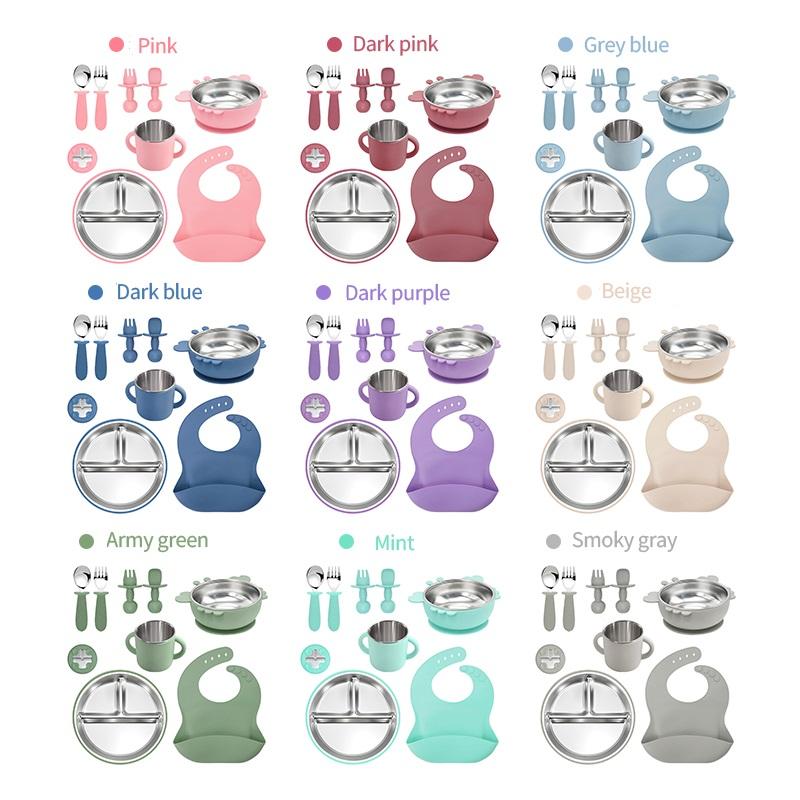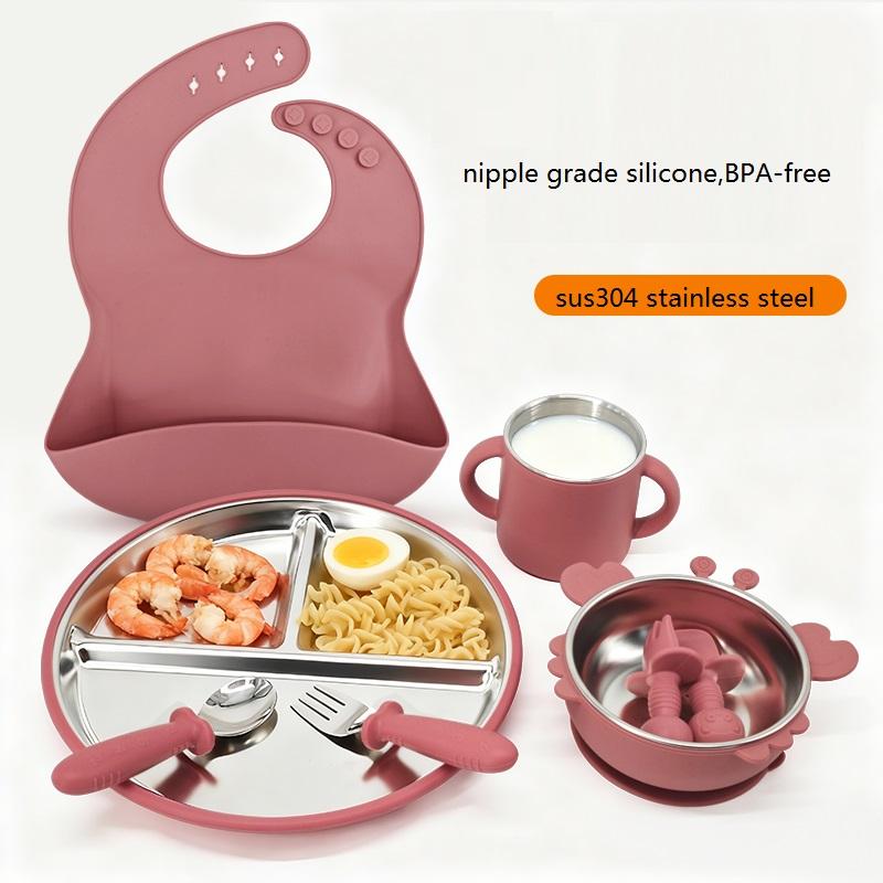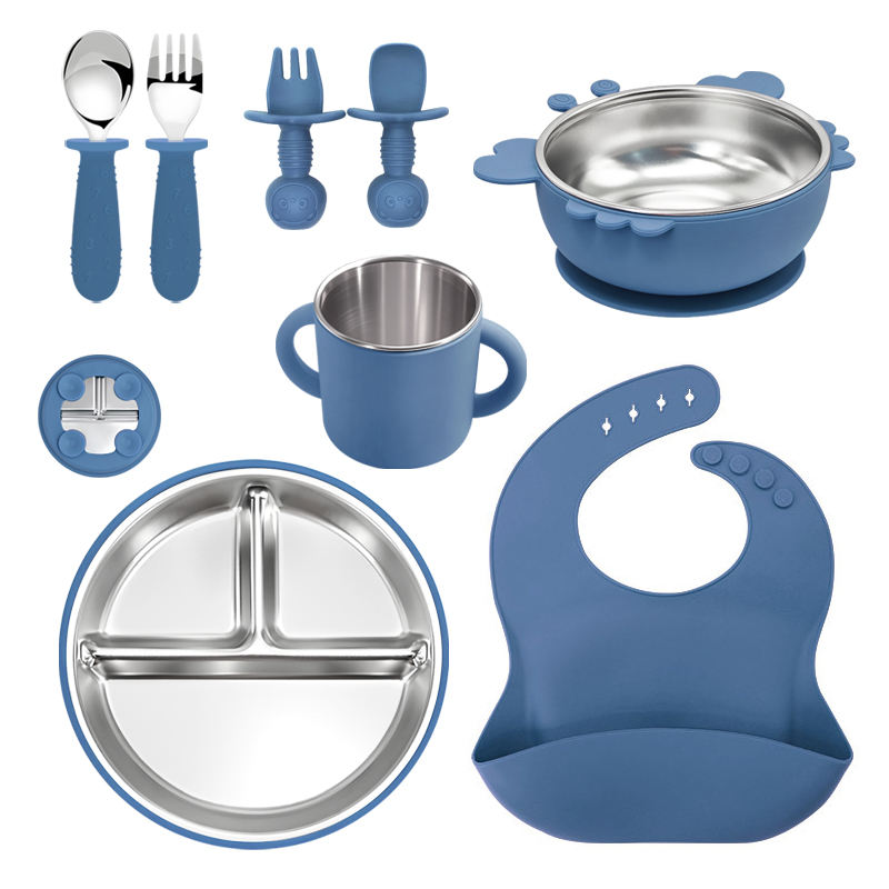 8pieces 304 Stainless Steel Baby&toddler Feeding Set Suction Divided Plates Bowls Pocket Bib Unbreakable Dishwasher Safe