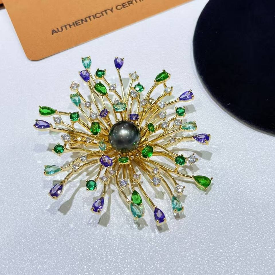 9-10mm Tahiti Seawater Sparkling Fireworks Pearl Brooch High-End Chest Flower Gift for Mom and Girlfriend