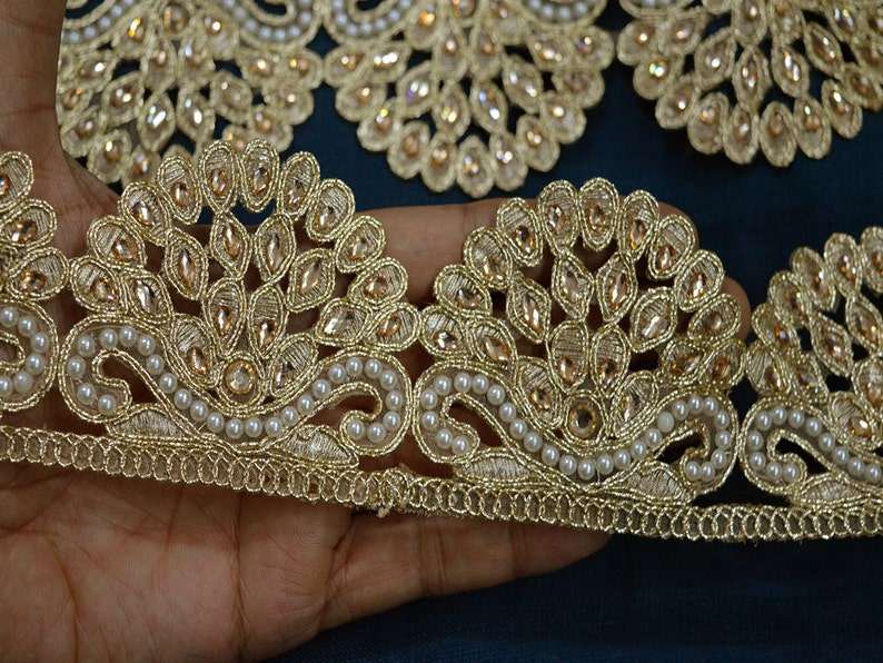 9 Yard Wholesale Trim Scallop Edge Saree Ribbon Costume Metallic Ribbon Beaded Gold Stone Lace Crafting Sewing Trimming Indian S