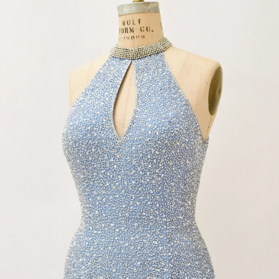 90s 00S Y2k Vintage Blue Silver Beaded Lycra Trumpet/Mermaid Floral Rhinestone Sequin Gown Medium Large Lillie Rubin Pageant
