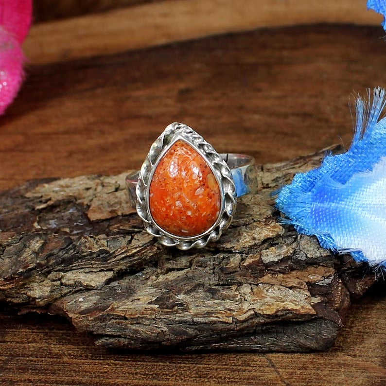 92.5 Sterling Silver Handcrafted Fine Ring Natural Orange Sponge Coral Gemstone Unique Natural Orange Sponge Coral Gemstone Ring