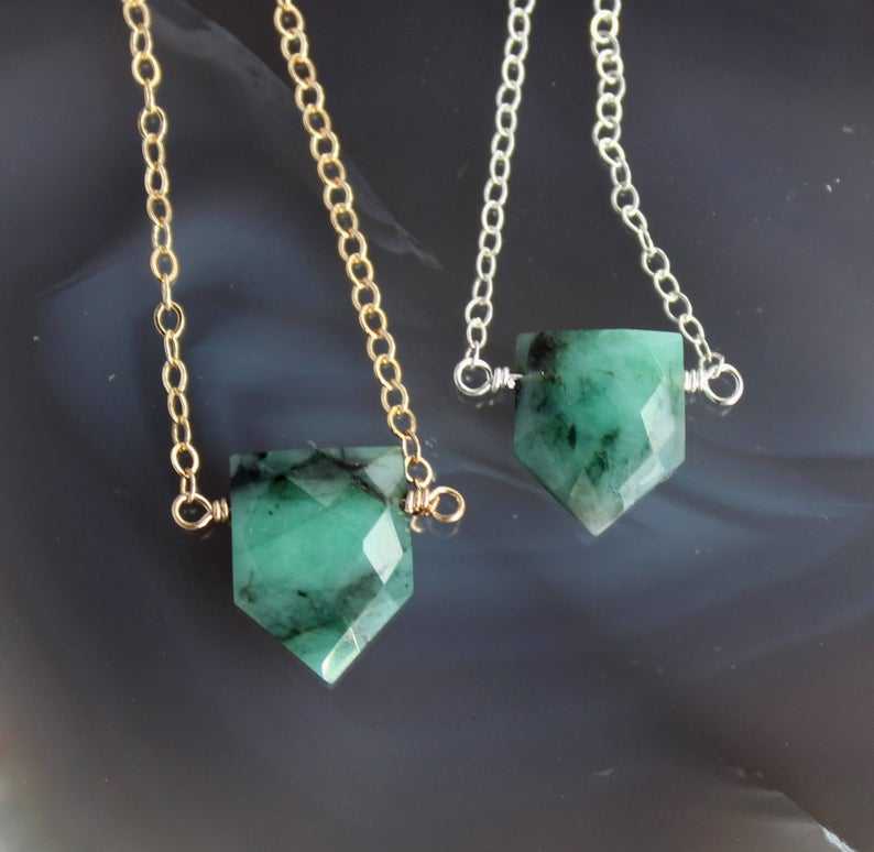 92.5 Sterling Silver 14\" Long Panna Briolette Beads Necklace Natural Emerald Pentagon Shape Geometric Pattern Women's