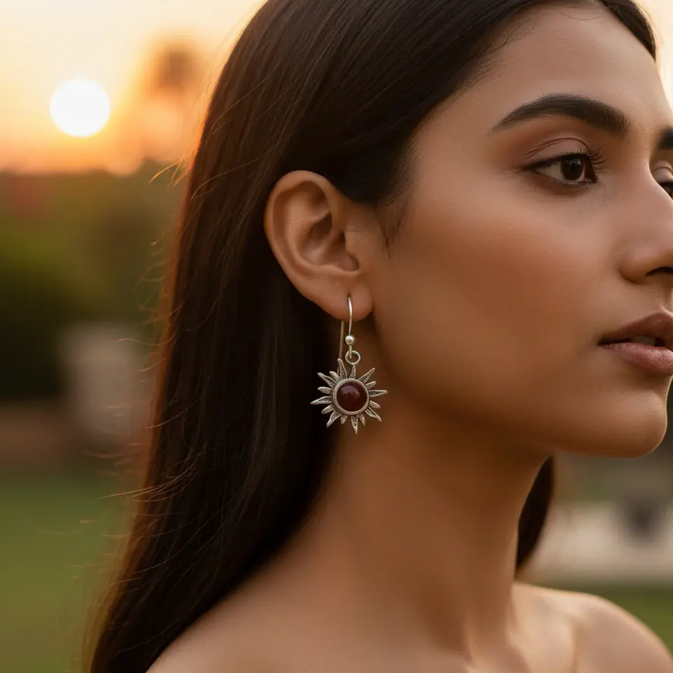 925 Gold Plated Sunburst Drop Earrings for Women Red Quartz Gemstone with Diamond and Pearl for Weddings and Parties