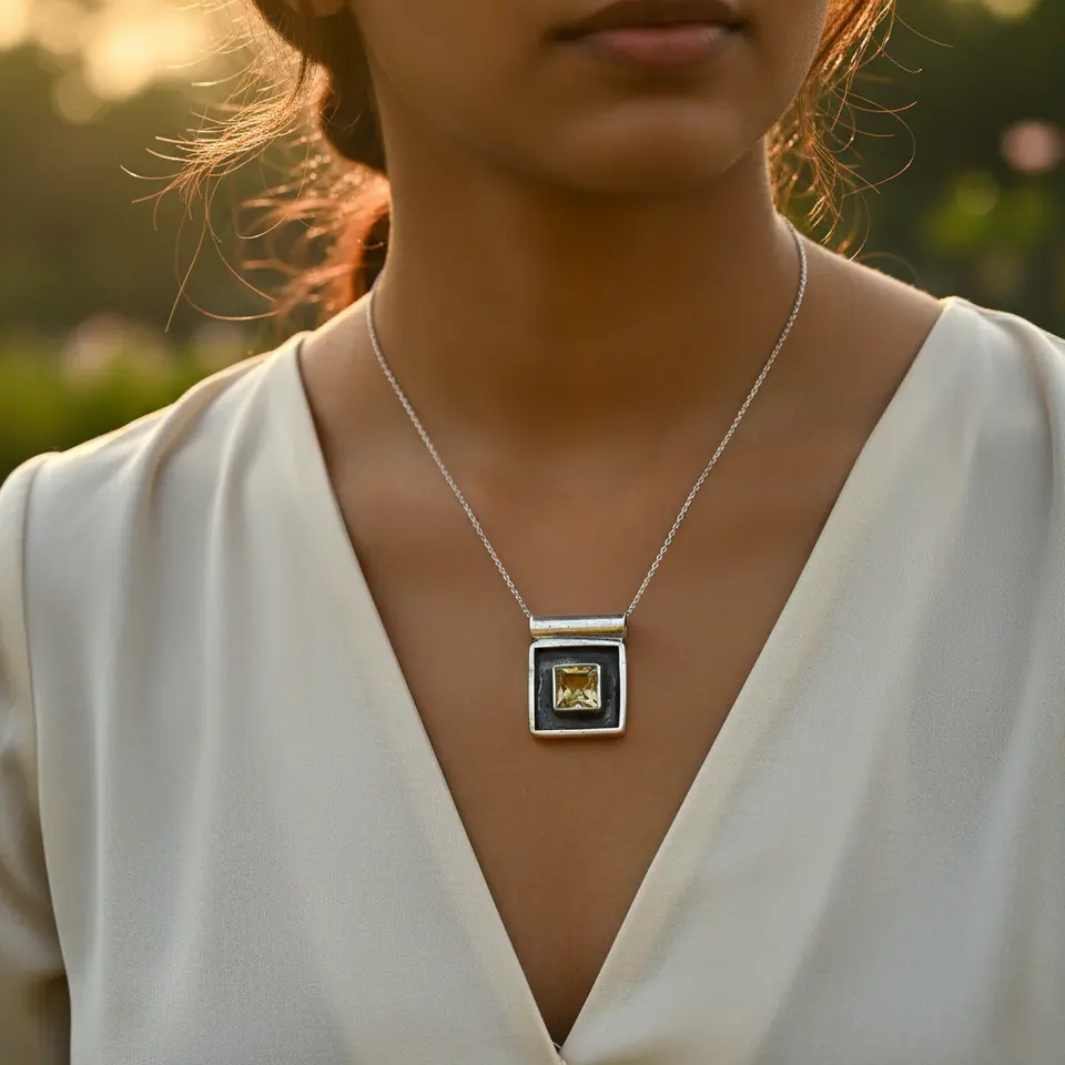 925 Rose Gold Pendant with Citrine Handmade Square Gemstone Charm for Women Rhodium Plated Number Pattern Main Material Jewelry
