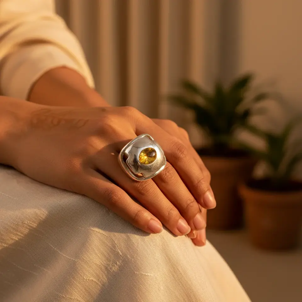 925 Silver Citrine Gemstone Ring for Women Gold Plated Statement Jewelry