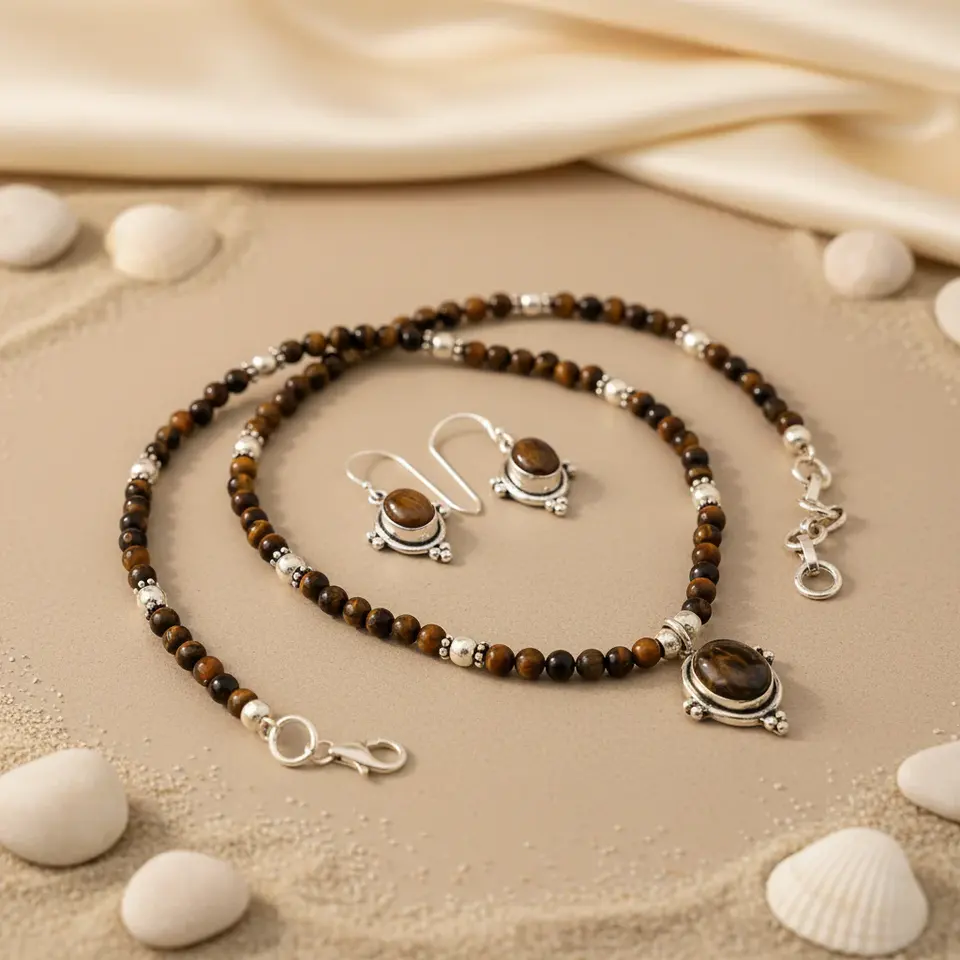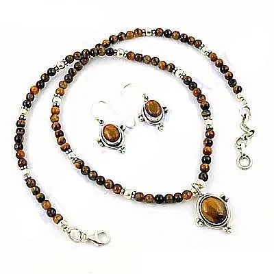 925 Silver Fine Jewelry Set Tiger Eye Bead Necklace & Earrings Rhinestone Crystal with Pearl Gold Plated for Party or Gift
