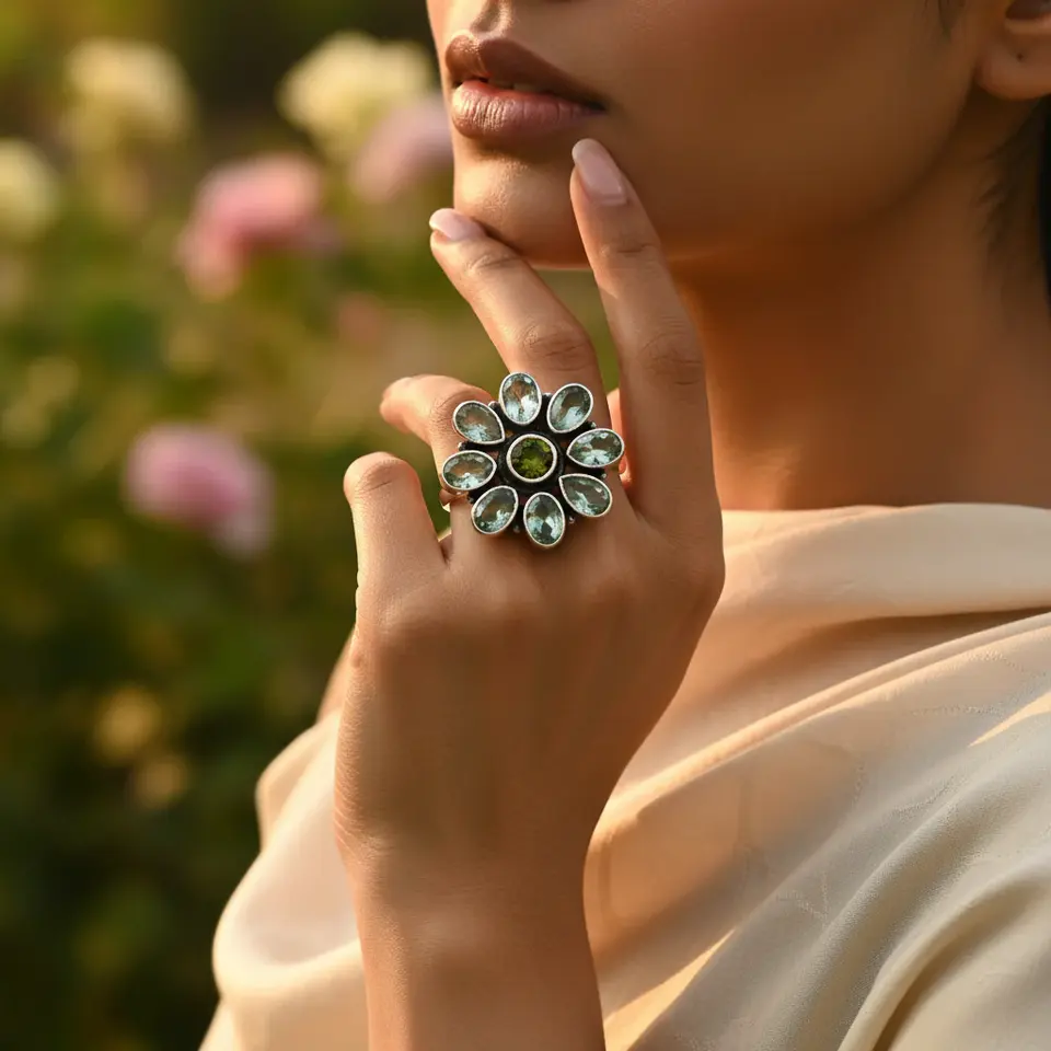 925 Silver Flower Stud Earrings with Green Gemstones Women's Fashion Ring
