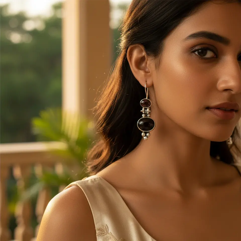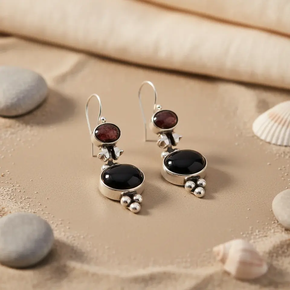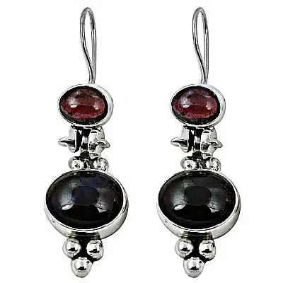 925 Silver Gemstone Jewelry Onyx & Garnet Drop Earrings Fashionable Accessories