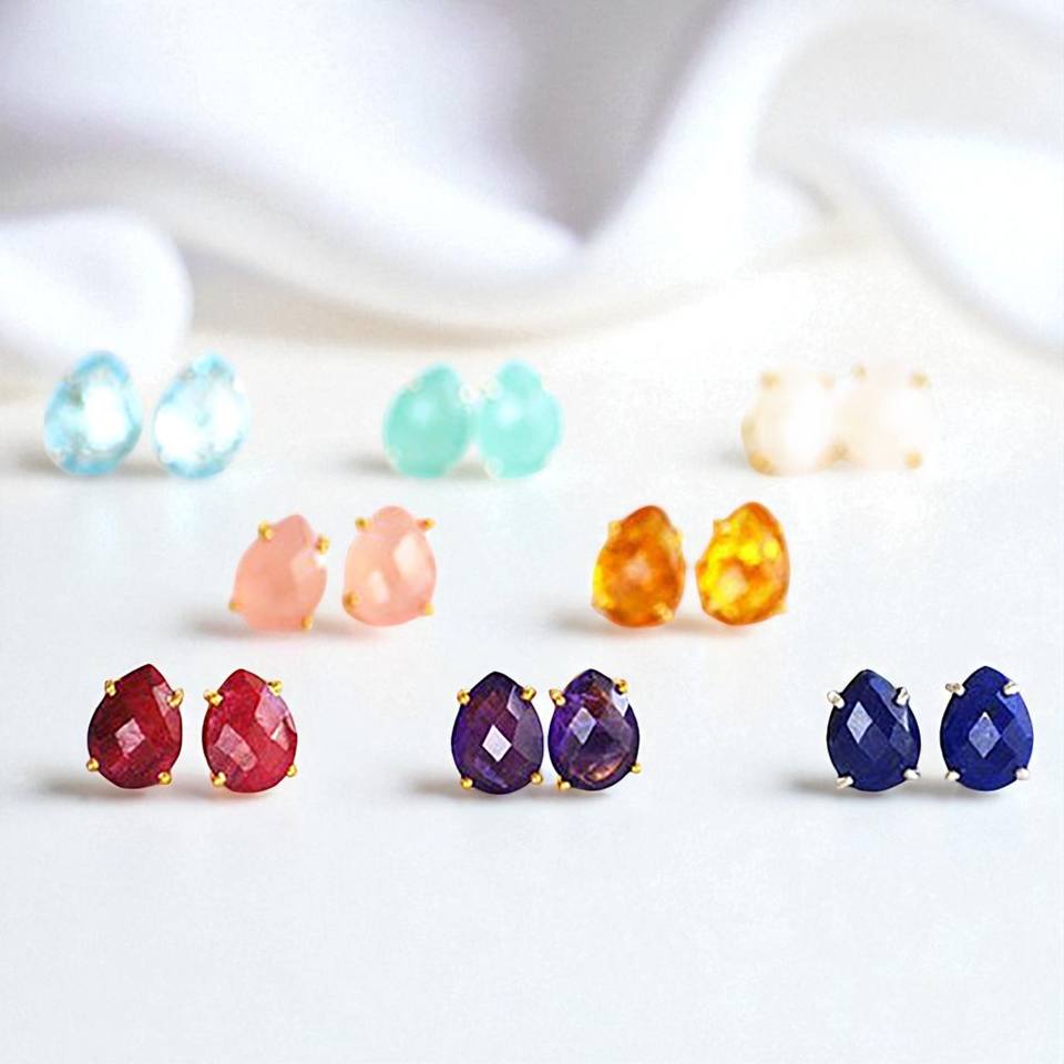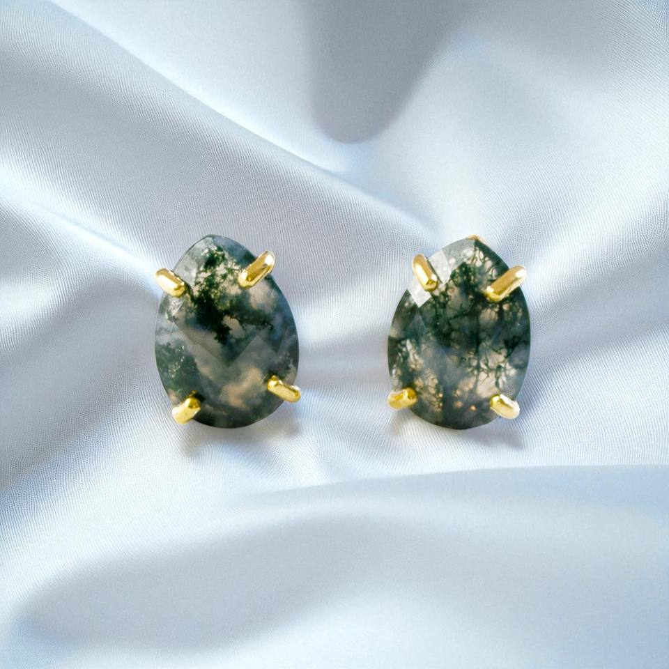 925 Silver Gold Plated Teardrop Faceted Moss Agate Gemstone Prong Set Studs Earrings Jewelry