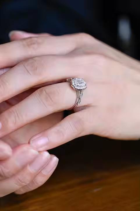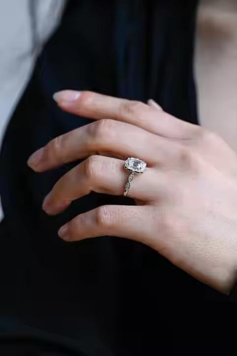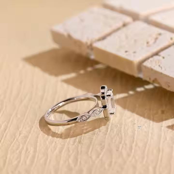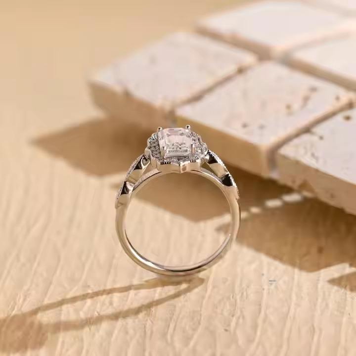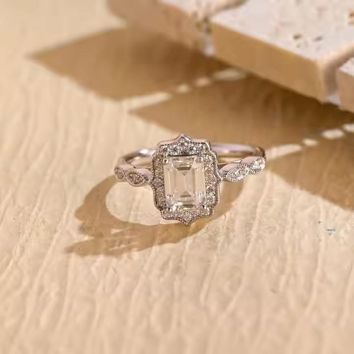 925 Silver Halo Emerald Cut Original Moissanite Engagement Ring Vintage Proposal Ring Unique Anniversary Birthday Gift for Women