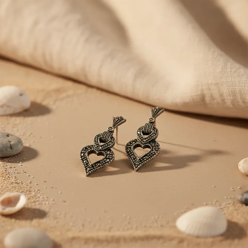 925 Silver Marcasite Heart Drop Earrings for Women Fashion Accessory