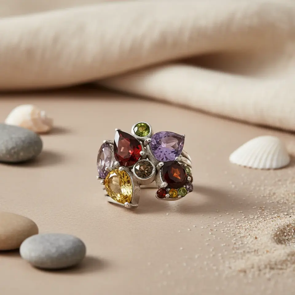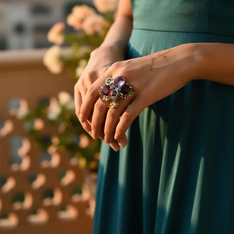 925 Silver Multi-Gemstone Cocktail Ring for Women Adjustable Fashion Jewelry with Oval Cut Diamonds Gold Plated Inlay
