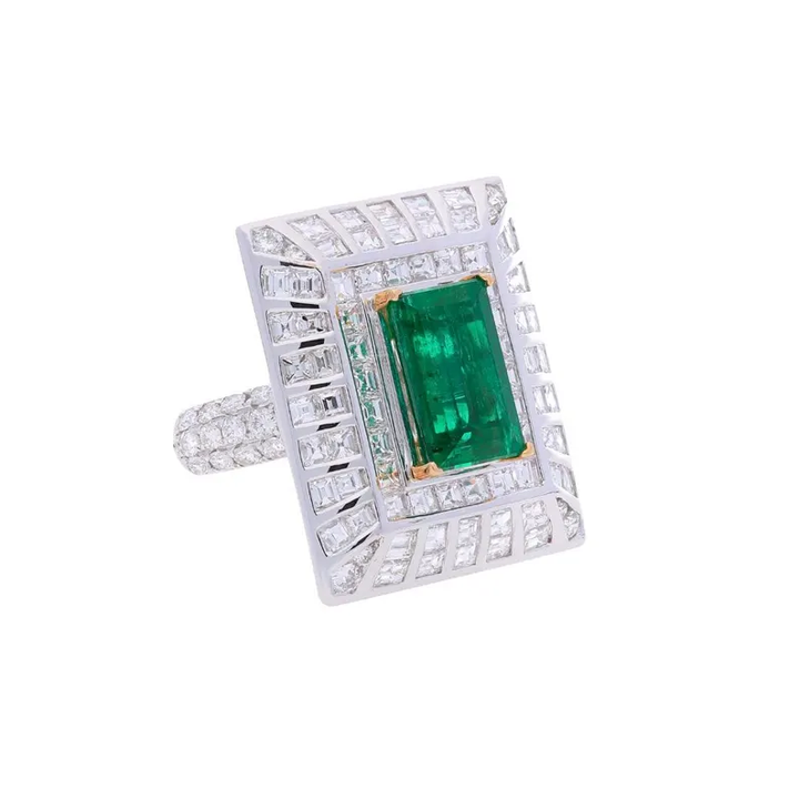 925 Silver Plated 5.17 Carat Colombian Emerald and Baguette Diamond Halo Rectangle Art Deco Style Wide Frame Ring