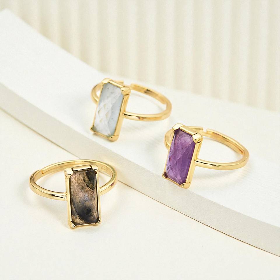 925 Silver Rectangle Amazonite Gemstone Ring - Gold Plated Bezel Ring for Women - Plain Straight Band Ring