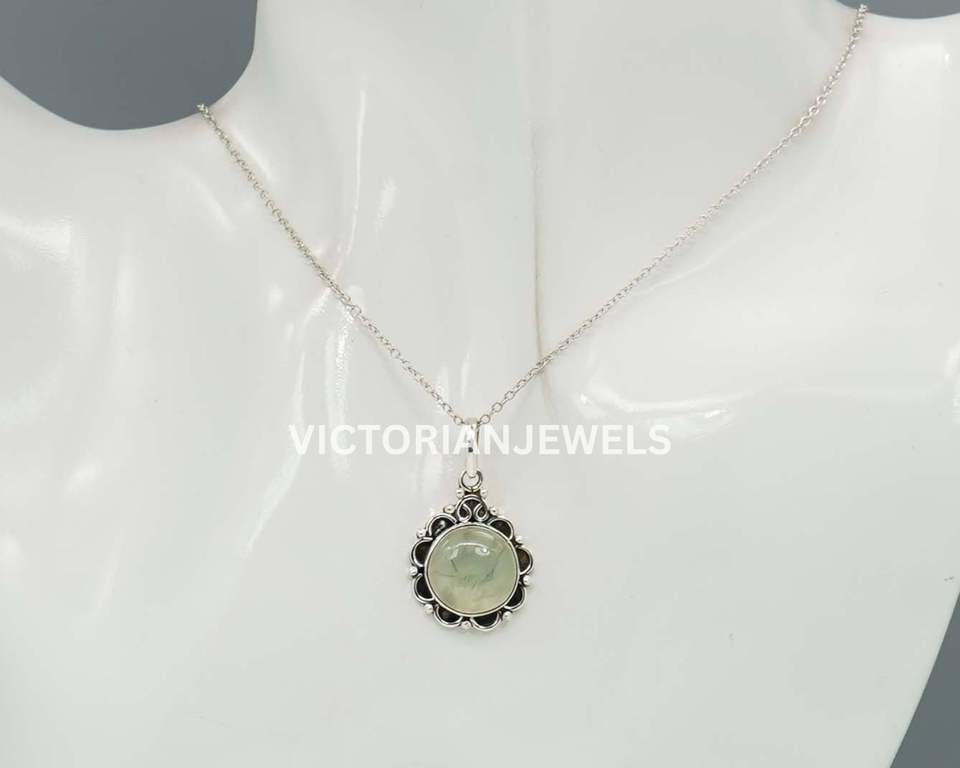 925 Solid Sterling Silver August Month Birthstone Prehnite with Bezel Setting Flower Style Charm Pendant