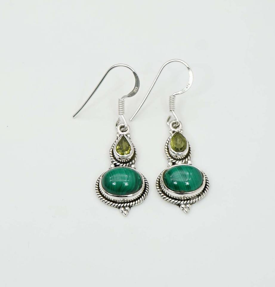 925 Solid Sterling Silver Green Malachite April and Peridot Two Stone Long Hook Charm Women's Earring