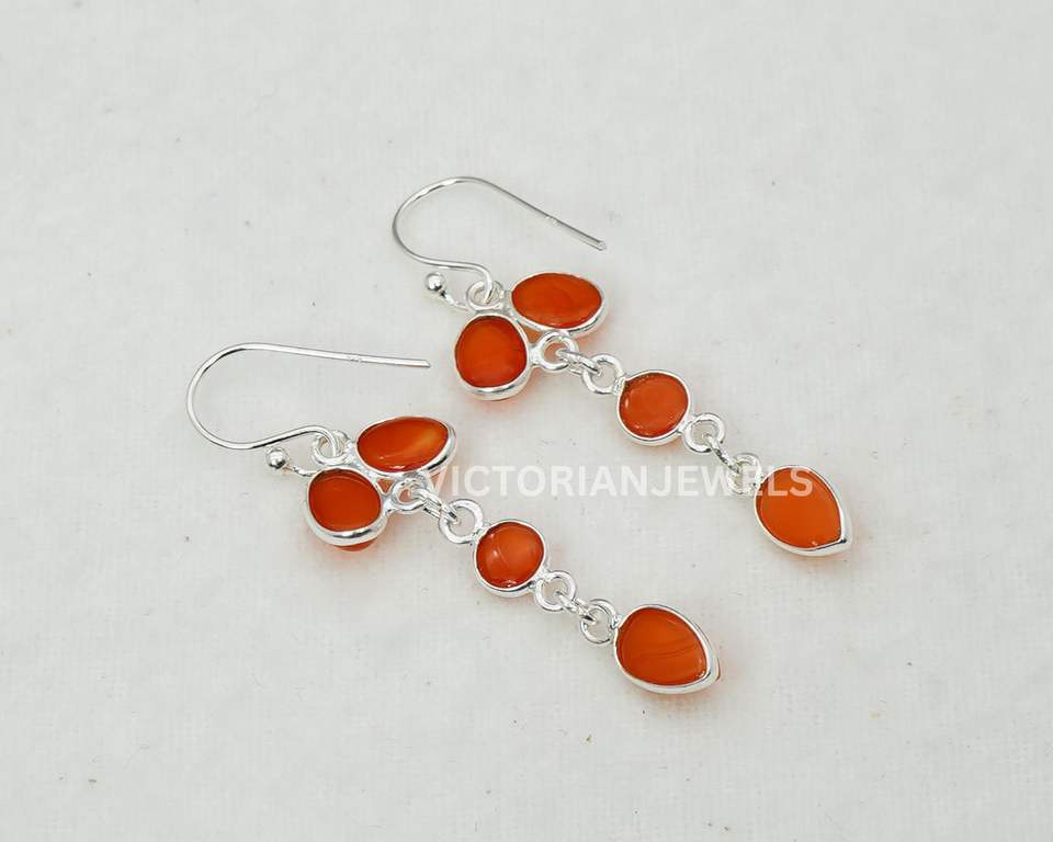 925 Solid Sterling Silver Red Carnelian July Month Birthstone Four Stone Long Hook Earring