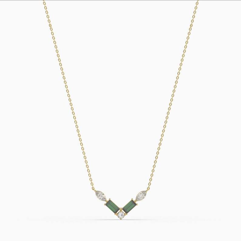 925 Sterling Silver 14K Gold Plated Green Baguette V Necklace Natural Chevron Pendant Minimalist Gemstone Cluster Jewelry Gift
