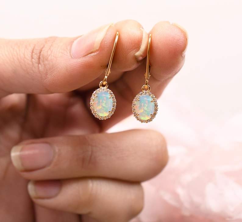 925 Sterling Silver 14K Gold Plated Opal Leverback Earrings Halo Design Bridal Jewelry For Women