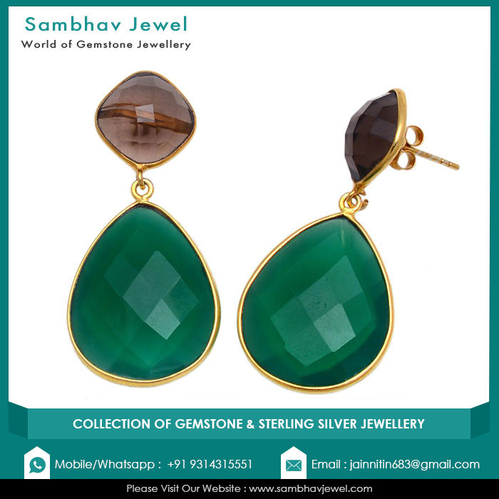 925 Sterling Silver 18K Gold Plated Handmade Drop Earrings Natural Gemstone Vintage Onyx Zircon Smokey Green Wedding Gift