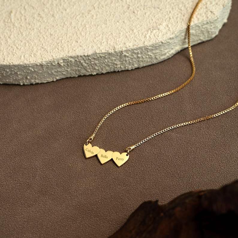 925 Sterling Silver Yellow Gold Plated Christian Family Name Hearts Necklace Minimalist Multiple Heart Engraved Pendant