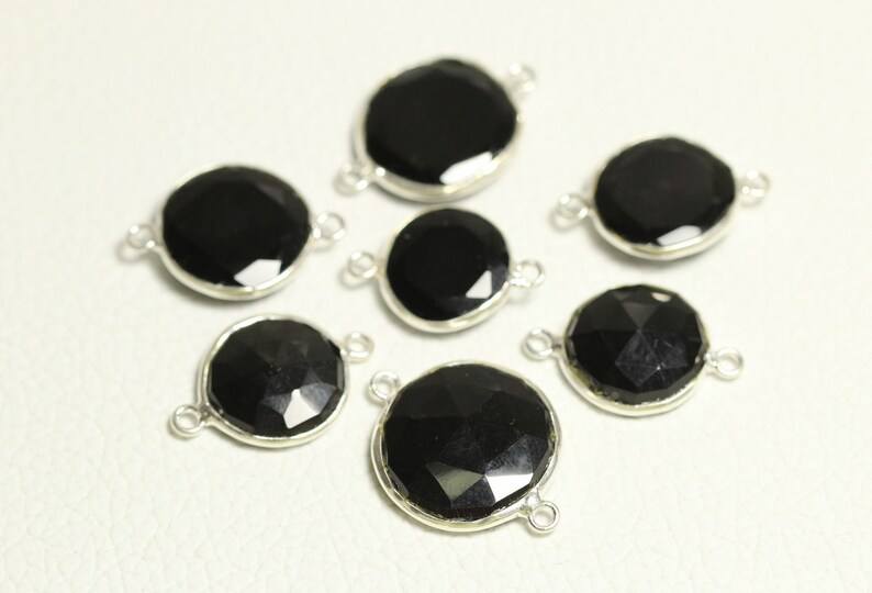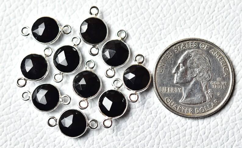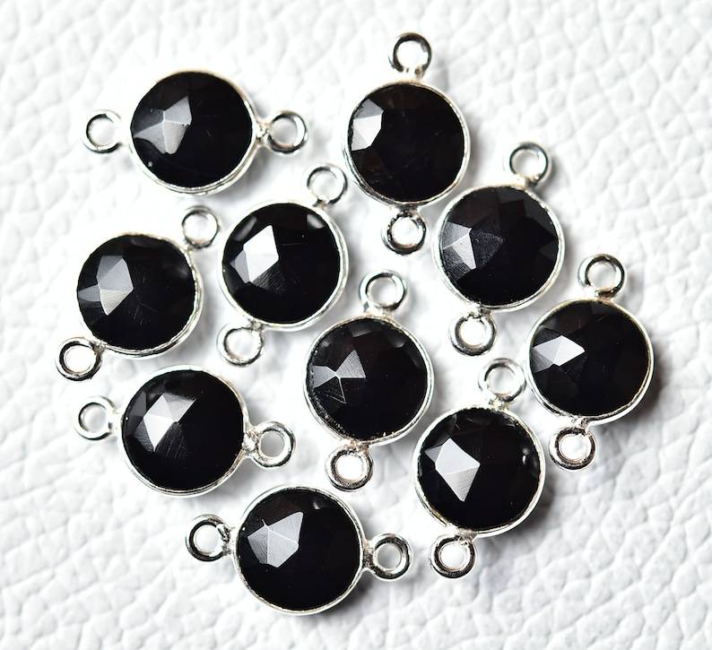 925 Sterling Silver 8mm Natural Black Onyx Rose Cut Cabochon Round bezel Setting Link Charm Connectors Making Necklace Jewelry