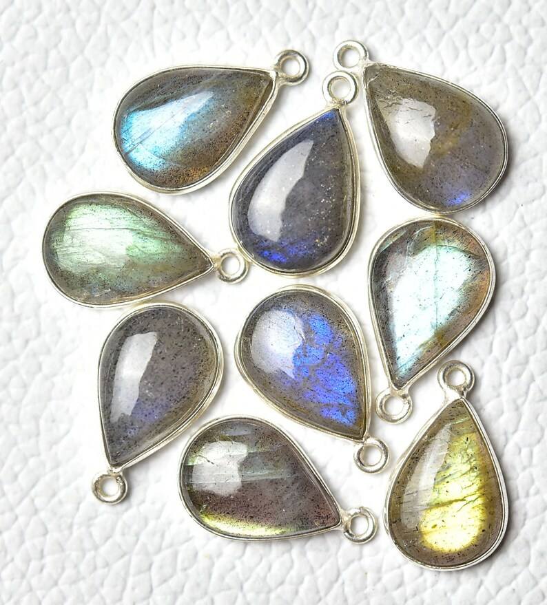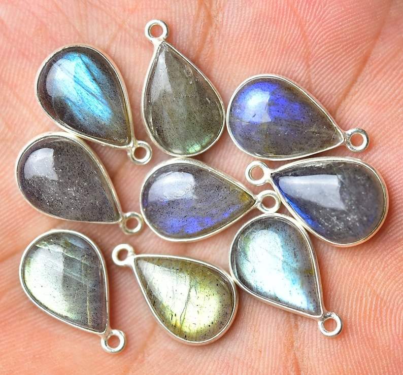925 Sterling Silver 9x12mm Natural Multi Color Labradorite Cabochon bezel Setting Double Loop Link Charm Connectors Making