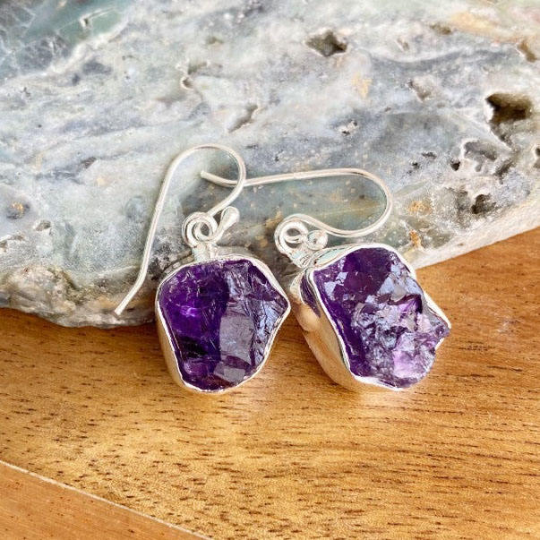 925 Sterling Silver Amethyst Collet Earring Handmade Classic Raw Gemstone Hoop Birthstone Jewelry for Women Perfect Gift for Her