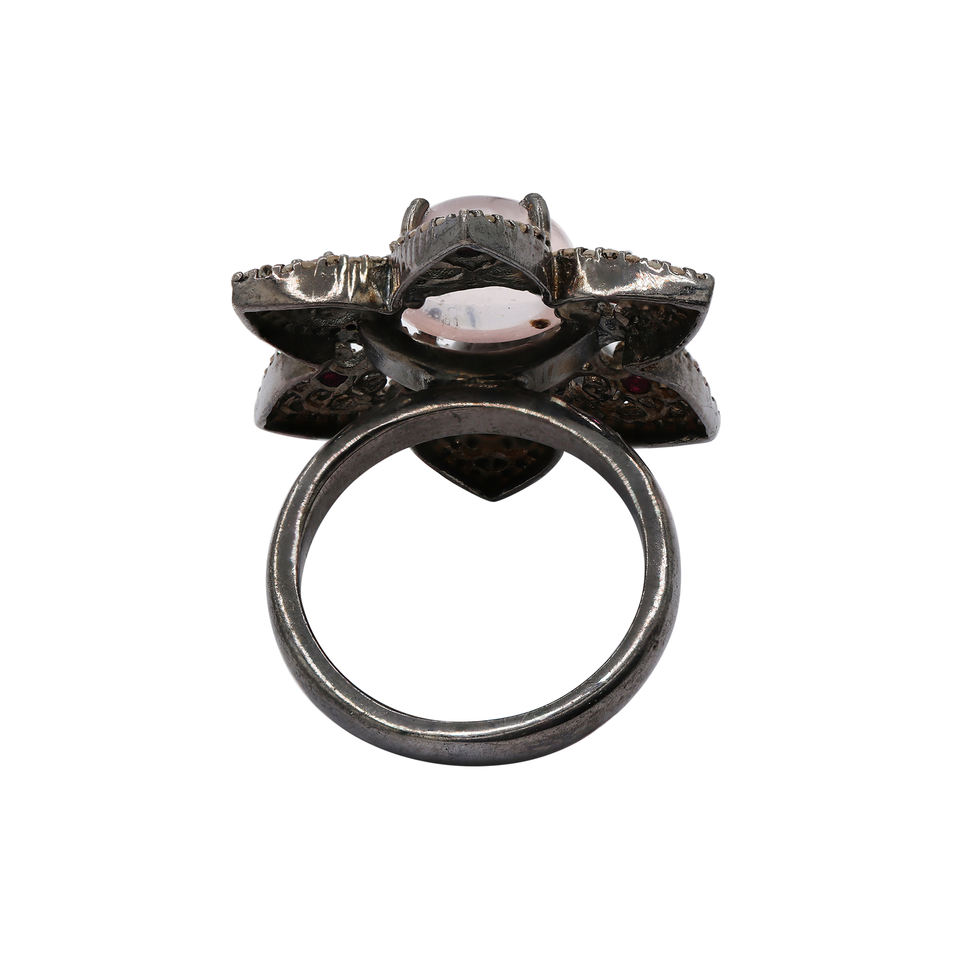925 Sterling Silver Black Rhodium Natural Rose Quartz, Ruby and Diamond Star Shaped Ring for Womens Wholesale Jewelry