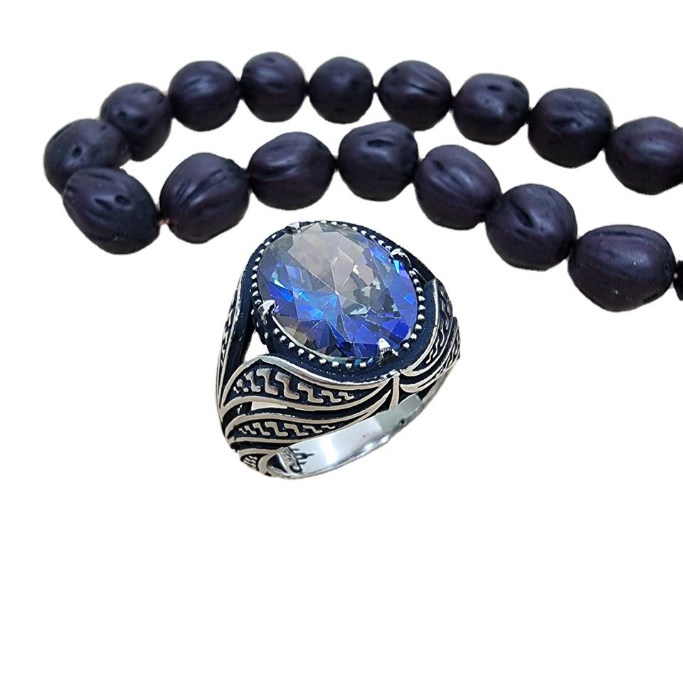 925 Sterling Silver Blue CZ Stone Men Ring Turkish Ring for Men Ottoman Arabic Trendy Ring Accessories Gift for Man Traditional