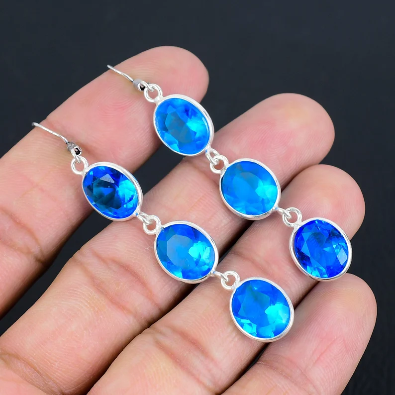 925 Sterling Silver Blue Topaz Gemstone Dangle Drop Earrings with Hook Wire Women/Girls Party Wholesale