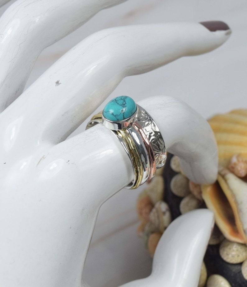 925 Sterling Silver Blue Turquoise Spinner Ring December Birthstone with Oval Shape Rhodium Plated Wedding Jewelry 925 Stamp